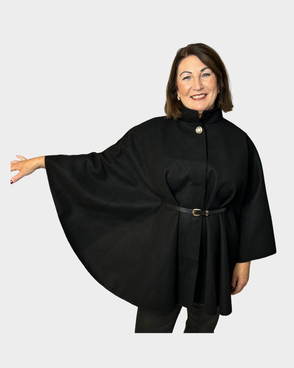 A flowing cape-style coat with a high collar, button detail, and slim belt for shape. Elegant, effortless, and ideal for layering through shifting seasons.