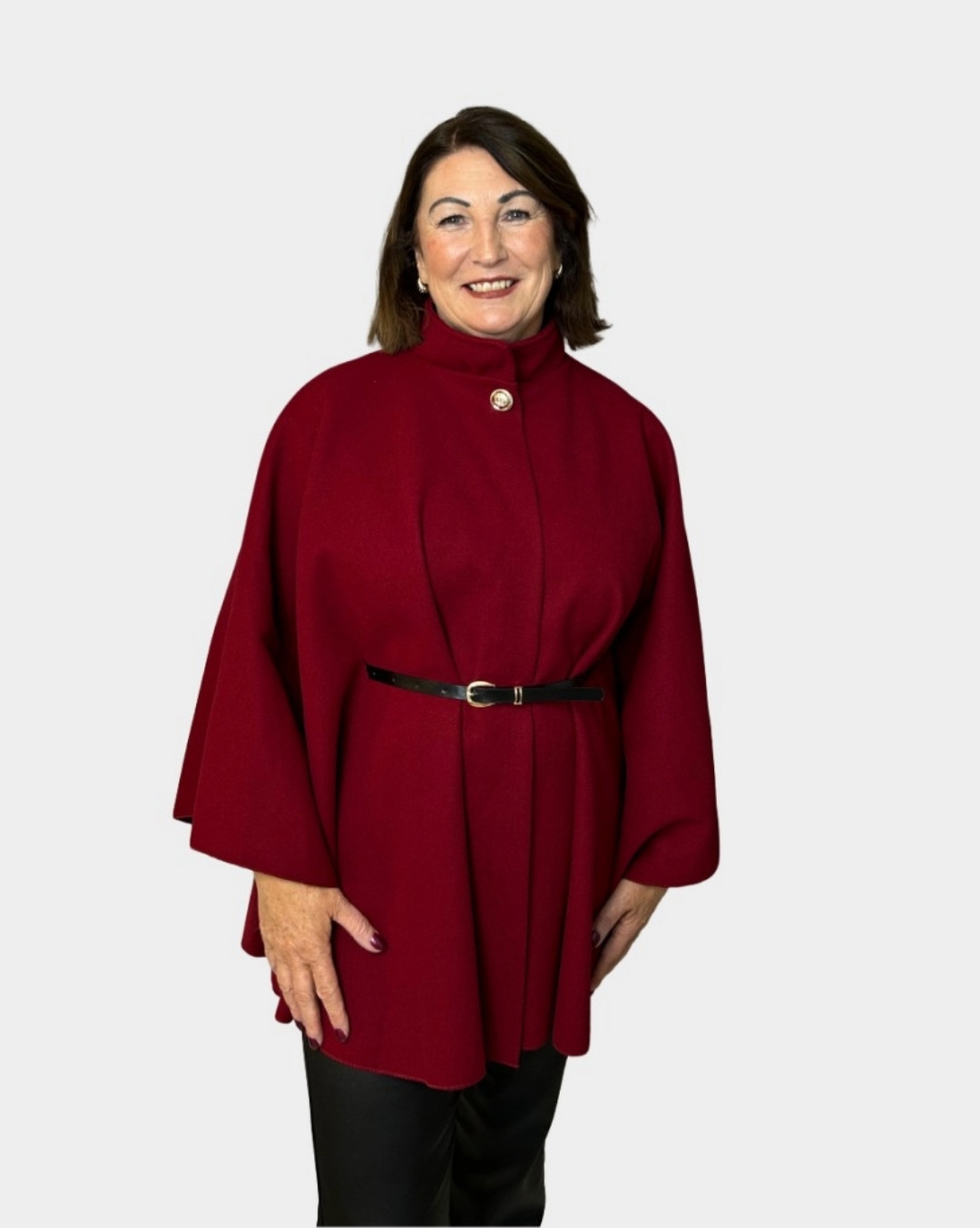 A flowing cape-style coat with a high collar, button detail, and slim belt for shape. Elegant, effortless, and ideal for layering through shifting seasons.