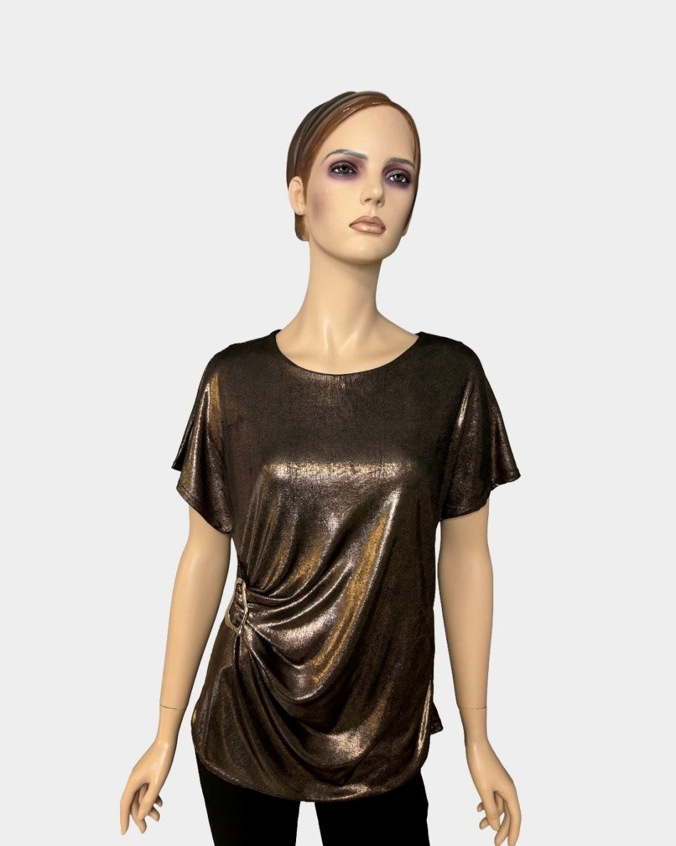 Elegant party top with soft draping and a gathered side detail finished with a gold buckle accent. Lightweight with a subtle shine for a polished evening look.