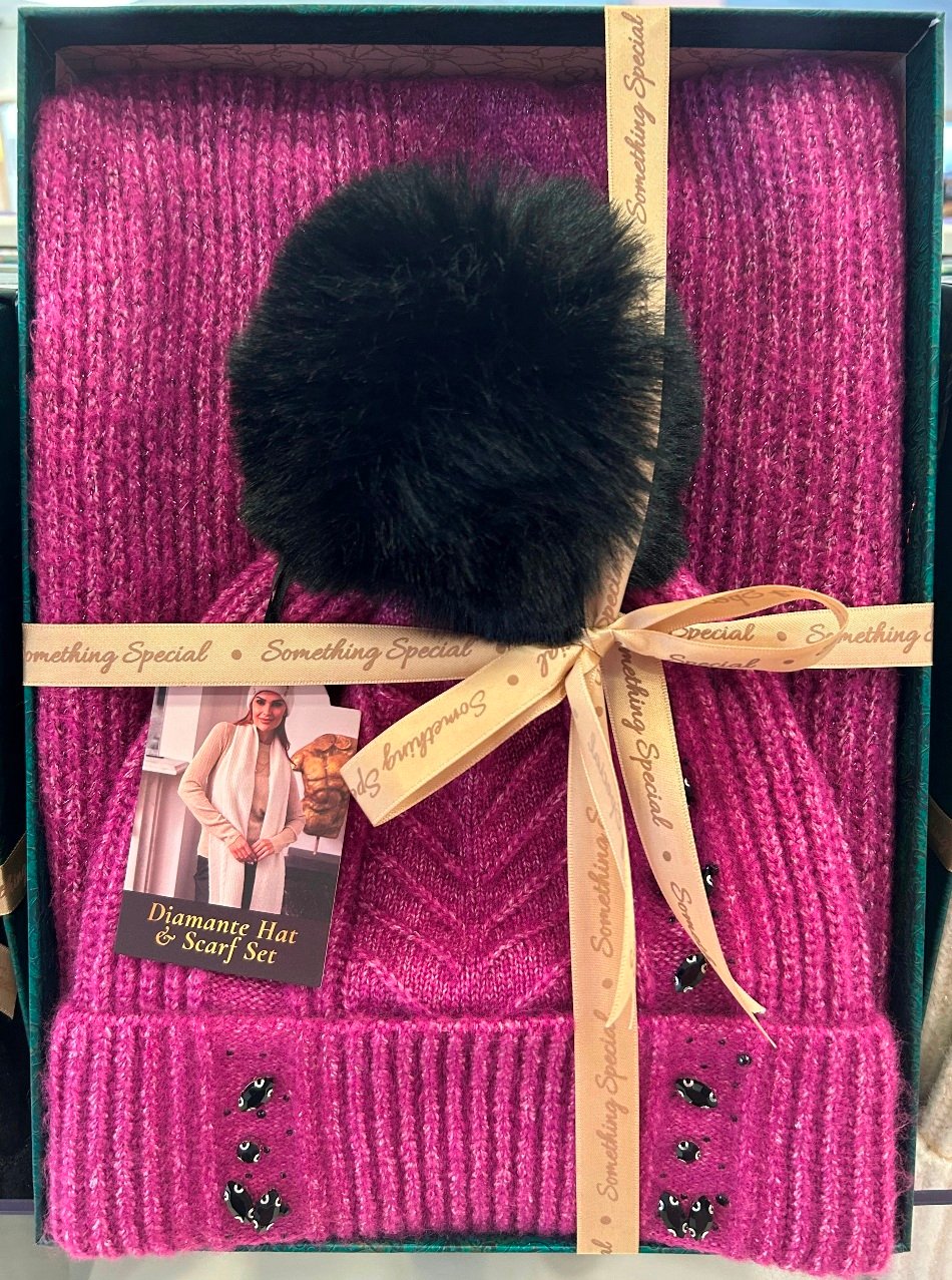Elegant ribbed knit hat and scarf set with sparkling crystal embellishments and a plush pom. Beautifully boxed with ribbon for gifting.