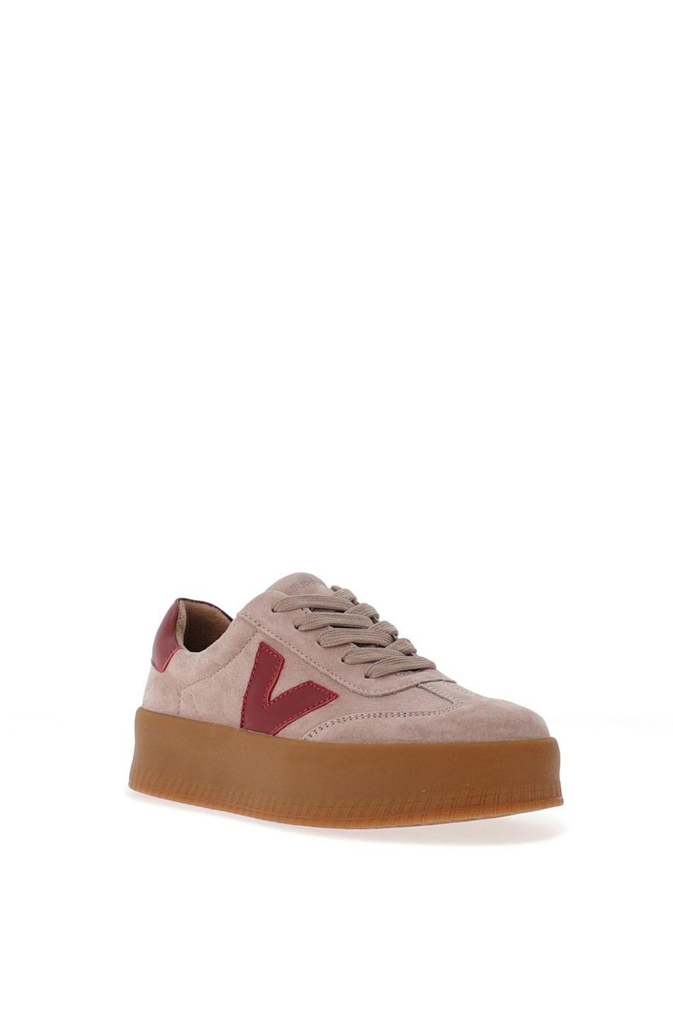 Pale pink trainers with bold burgundy accents and chunky gum sole, combining retro character with modern casual comfort.
