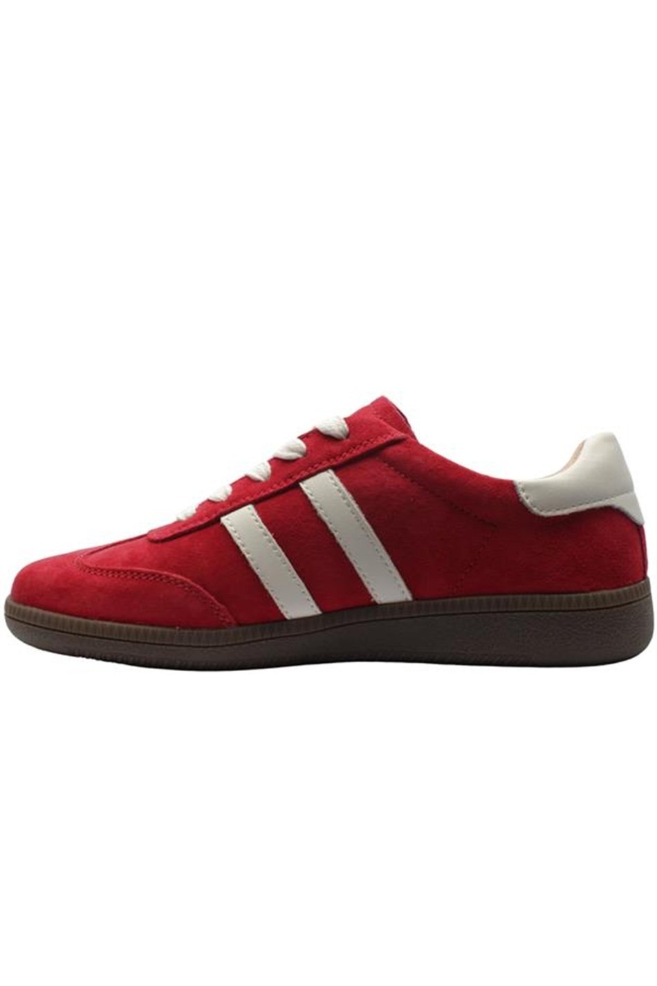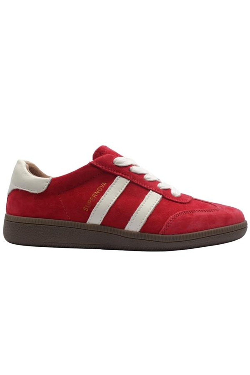 Bright red trainer with white striped detail and brown sole, designed for a confident casual statement look.