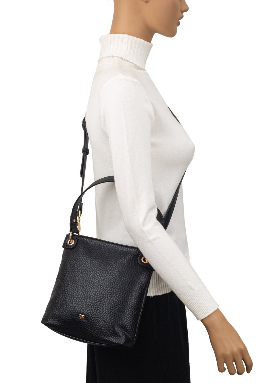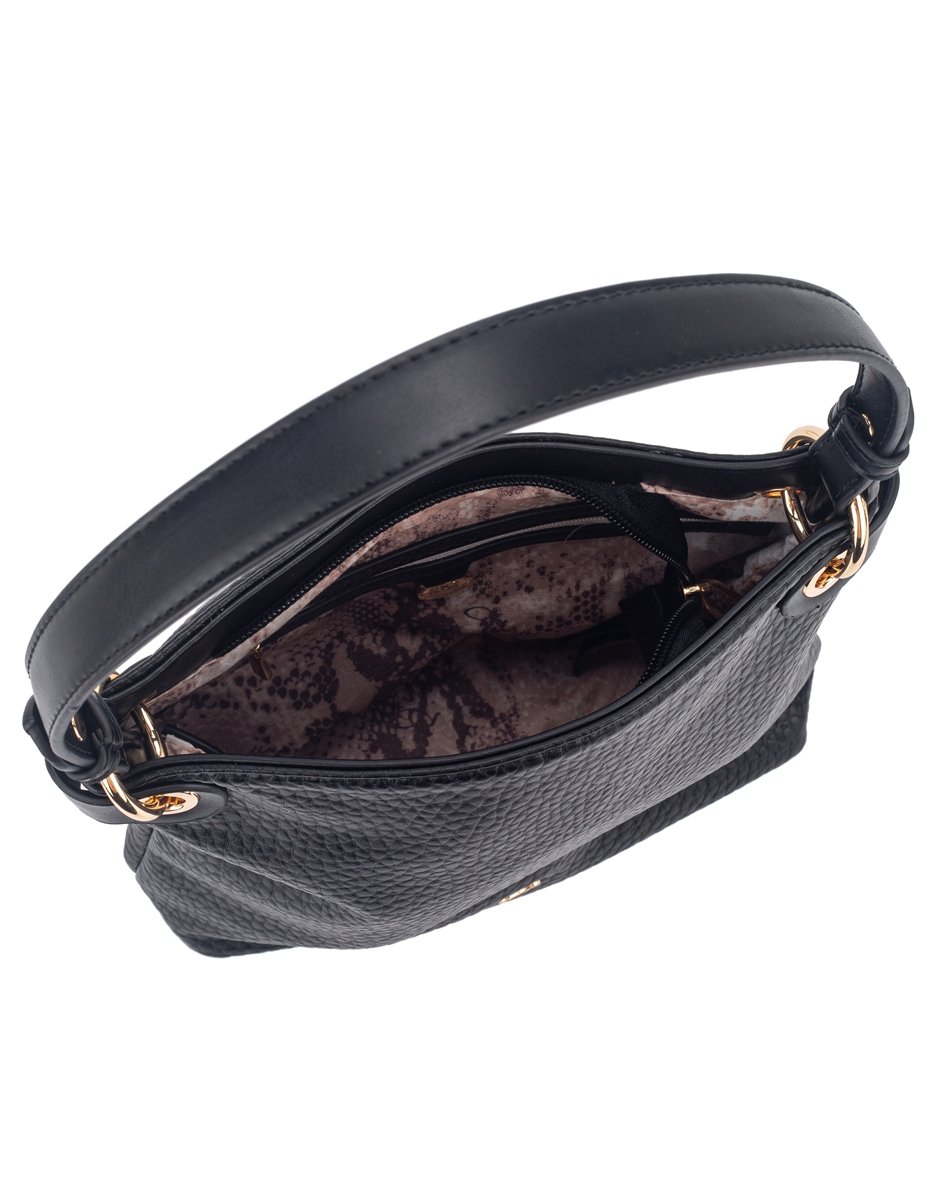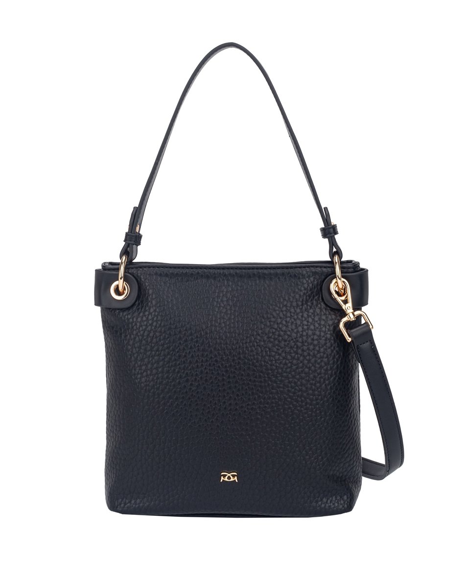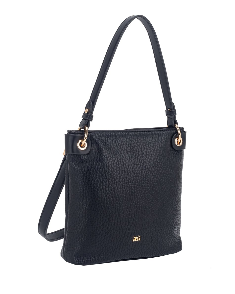 Sleek black handbag with slim rectangular shape, single handle, detachable strap, and gold-tone hardware. Minimal yet polished.