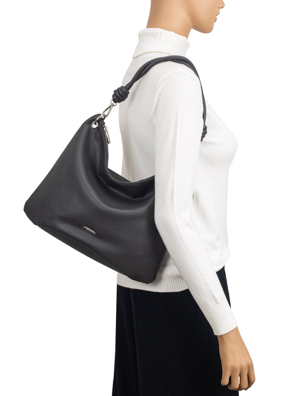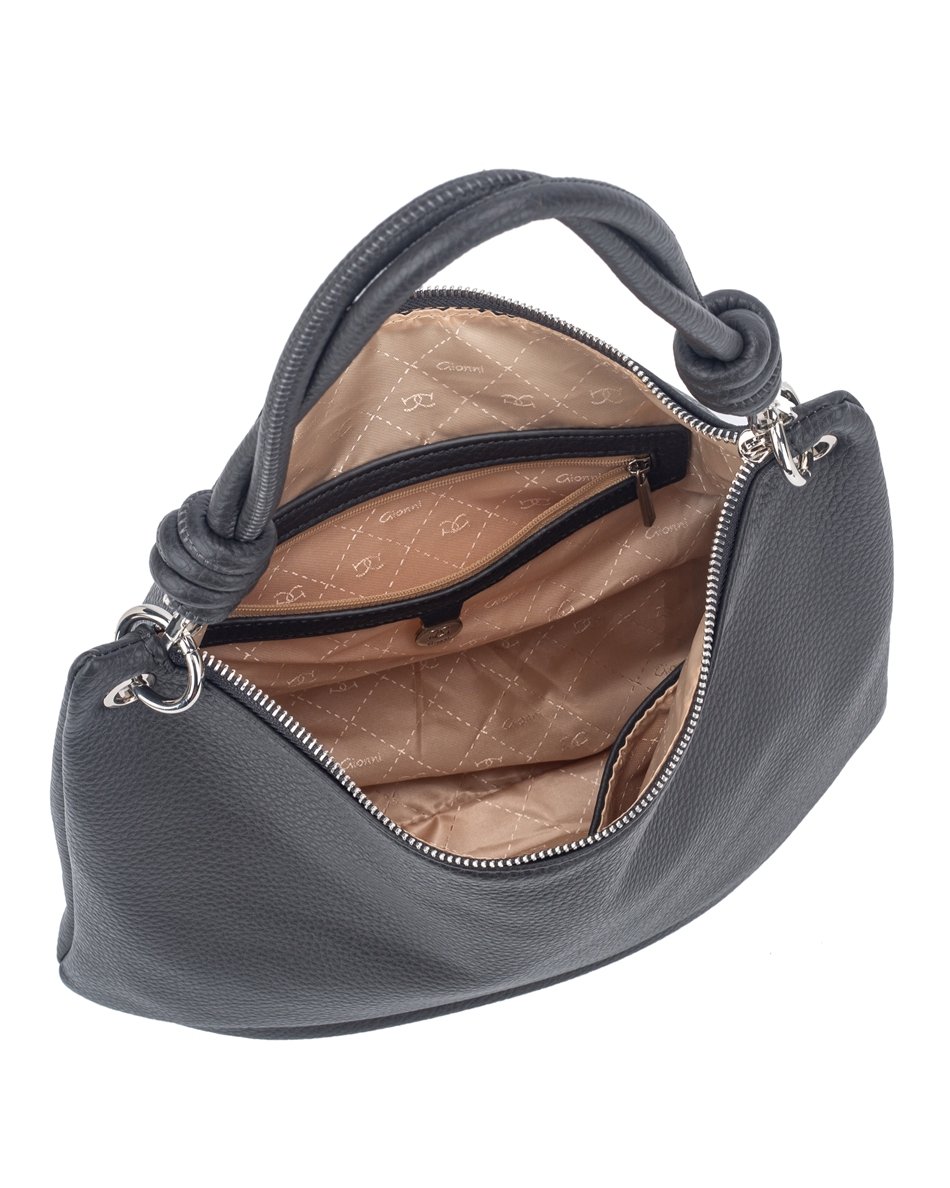 Charcoal handbag with soft silhouette, knotted handle detail, and detachable strap. Contemporary yet practical design.