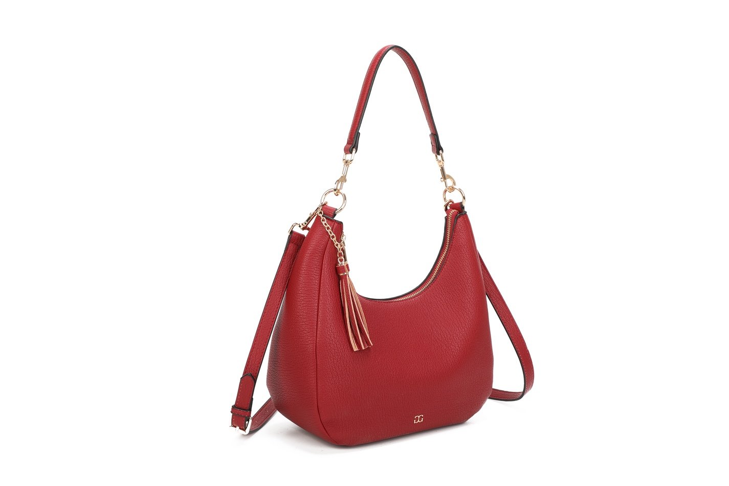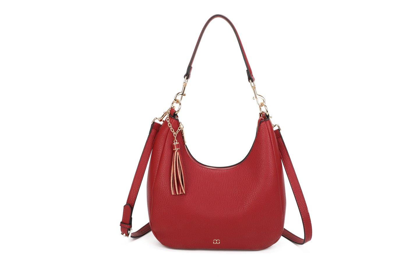Curved red hobo handbags with detachable strap, tassel charm, and gold accents. A chic and practical everyday choice.