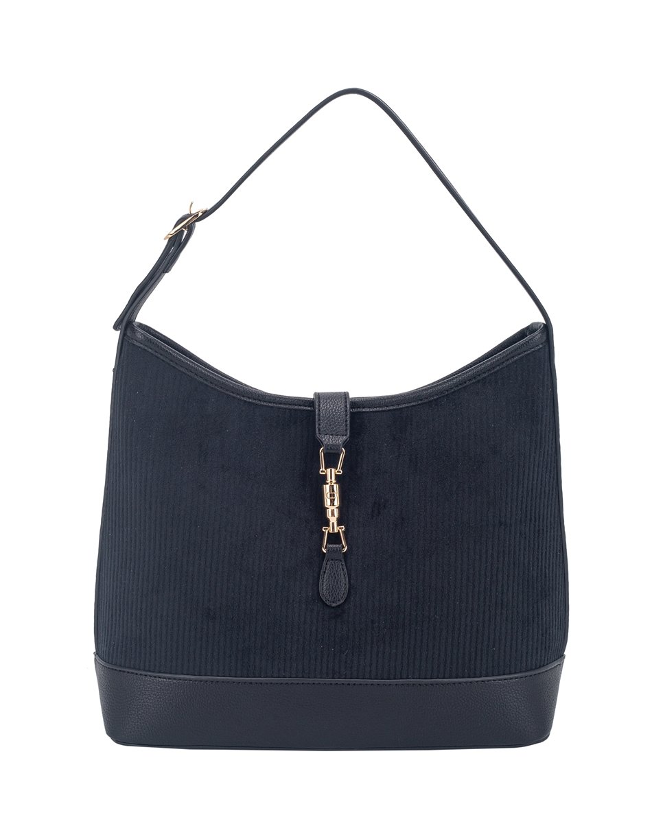 Spacious black hobo with curved top line, short strap, and gold tone clasp detail. Effortlessly chic everyday carry.