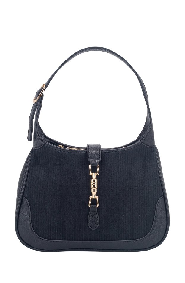 Compact black shoulder handbags with short strap, gold clasp detail, and softly curved silhouette. Refined yet practical.