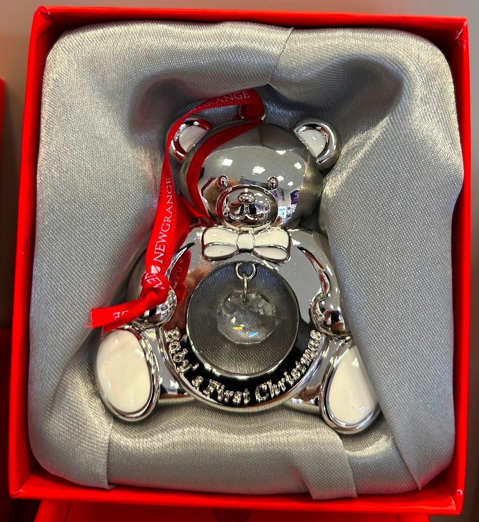 These ornaments show shiny teddy figures with a hanging crystal centre, created as keepsakes for celebrating a first seasonal milestone.