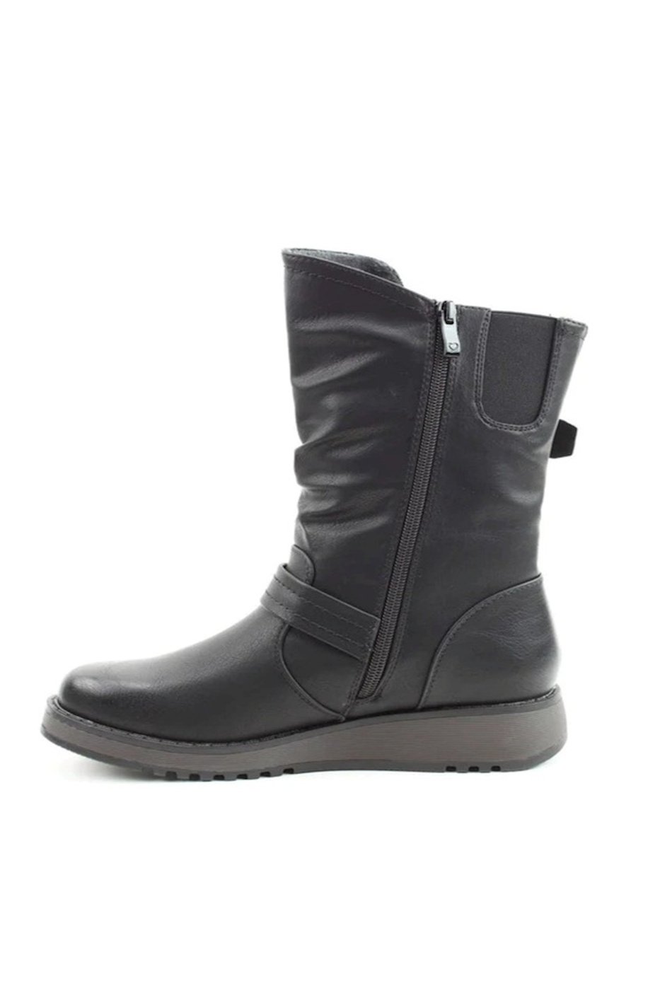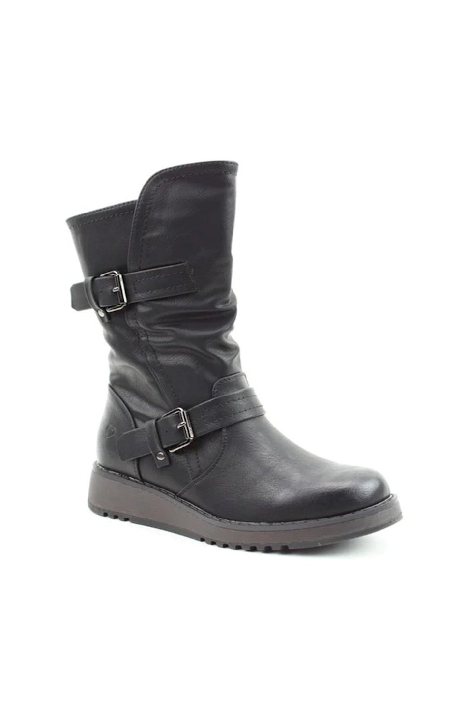 Memory Foam Boots. Black mid-calf biker-style boot with double buckle straps and casual wedge sole. Stylish and practical.