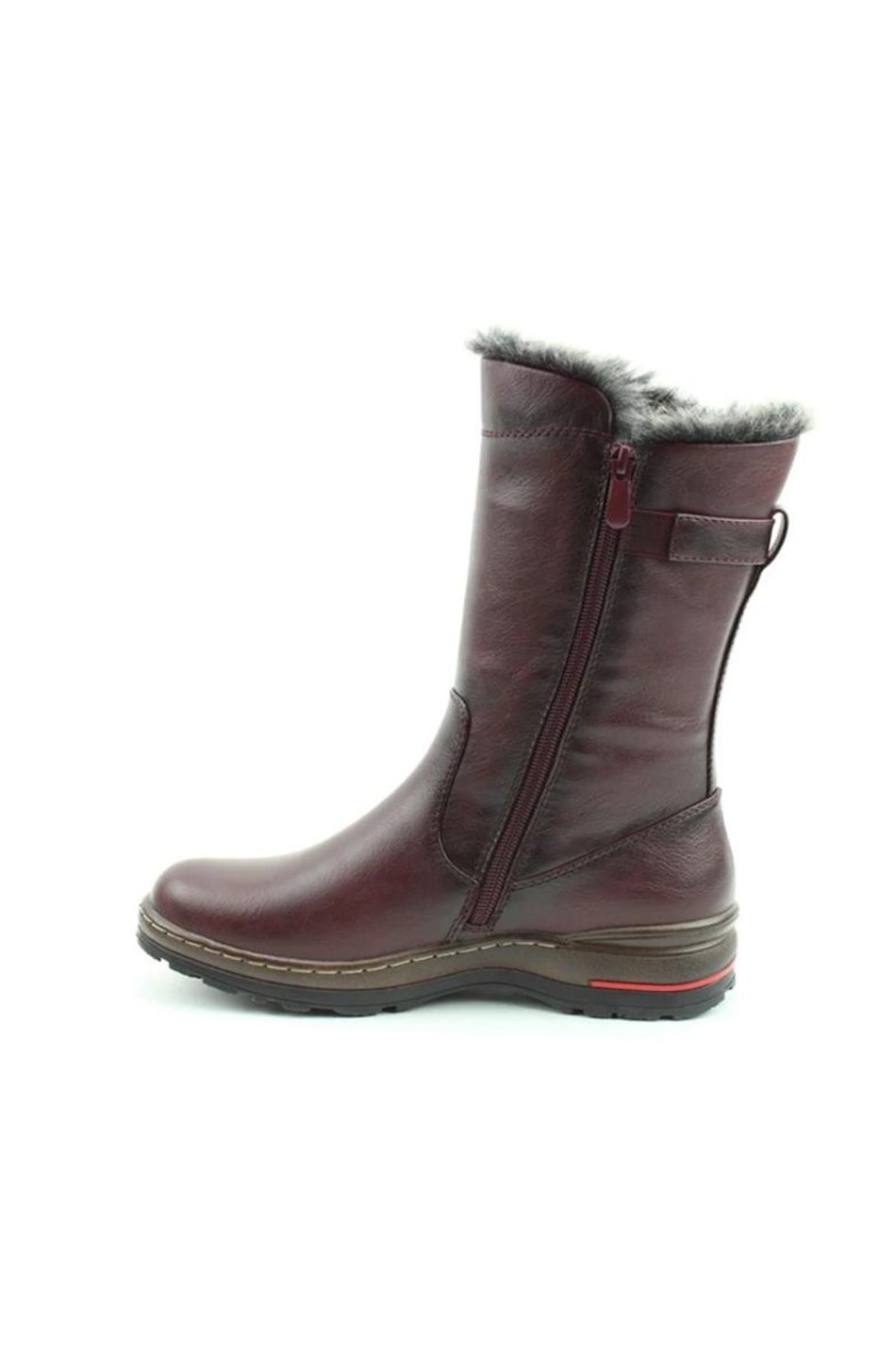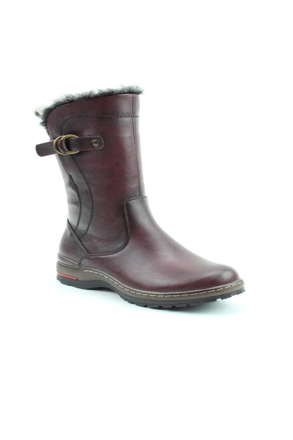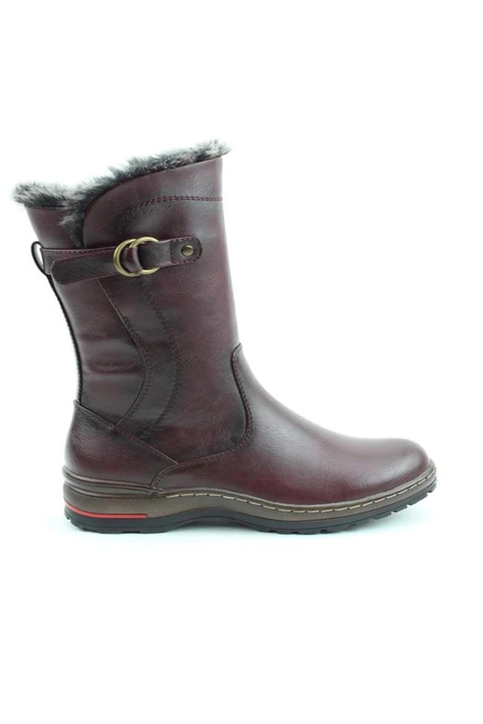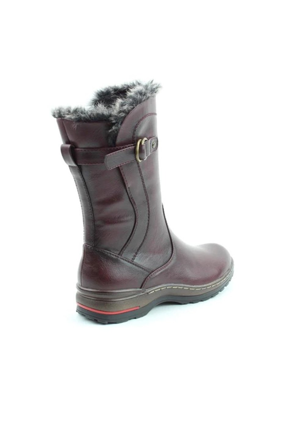 Memory Foam Boots. Rich burgundy mid-calf boot with faux fur lining, buckle strap detail and sturdy sole. Warm, stylish and practical for winter wear.