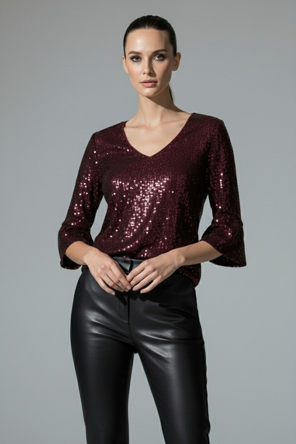 Rich burgundy sequin top with a V-neck and flared sleeves. Designed to dazzle, it offers a confident statement look for nights out or festive events.