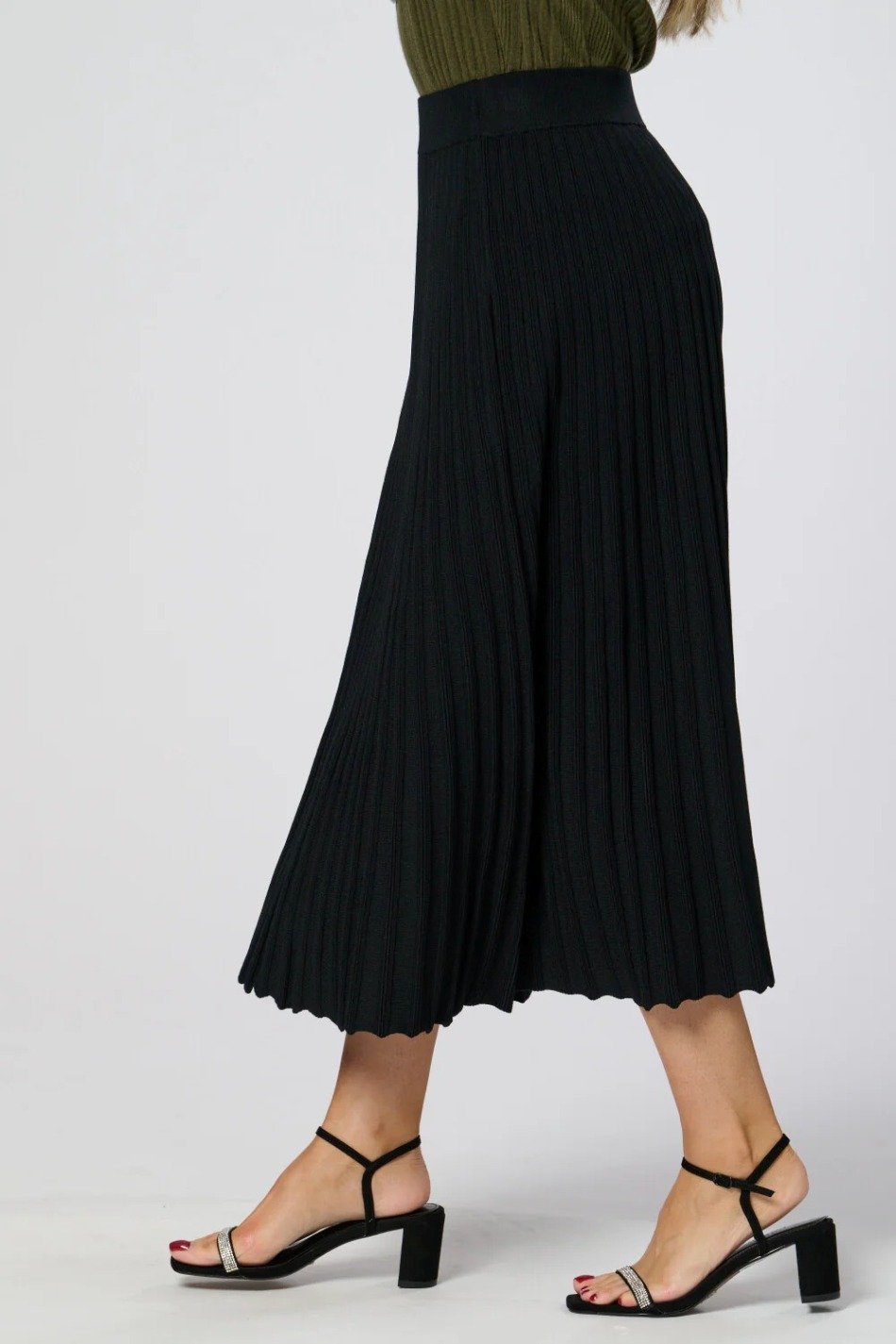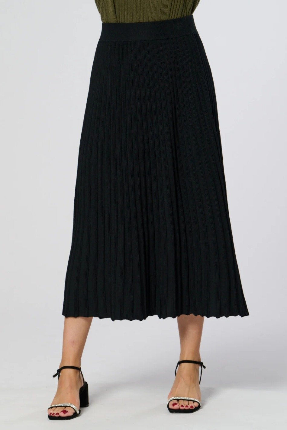 A black pleated skirt with soft structure and flow. Comfortable waistband and timeless silhouette for effortless everyday chic.