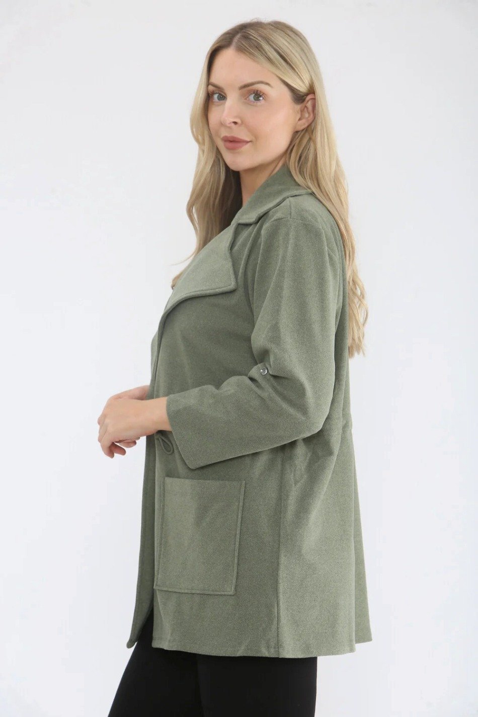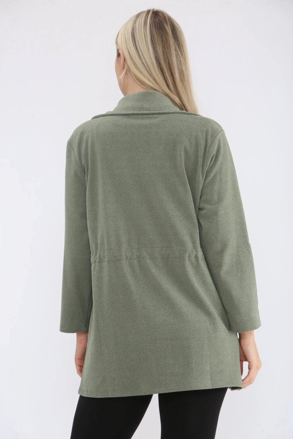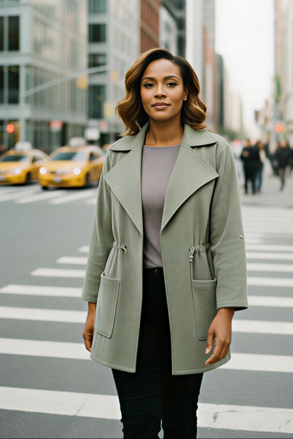 An olive short coat with drawstring waist, wide lapels, and deep pockets. A modern outer layer for cool transitional days.