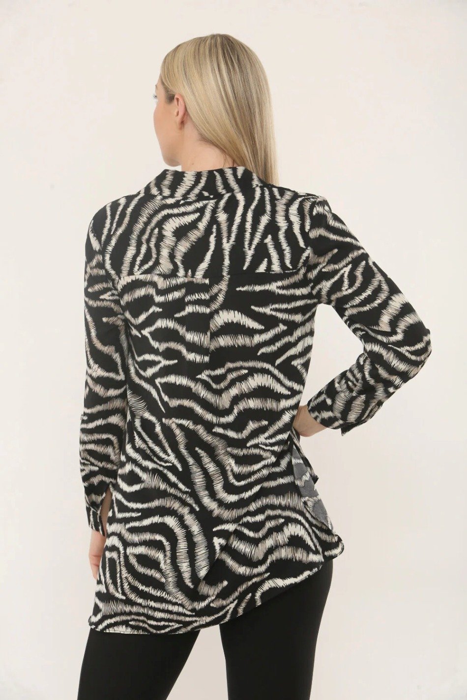 A relaxed tunic with striking zebra pattern, long sleeves, and a flattering v neckline. Easy to wear with leggings or jeans.