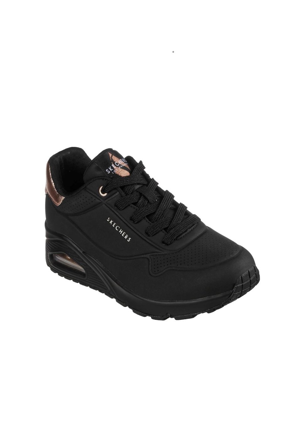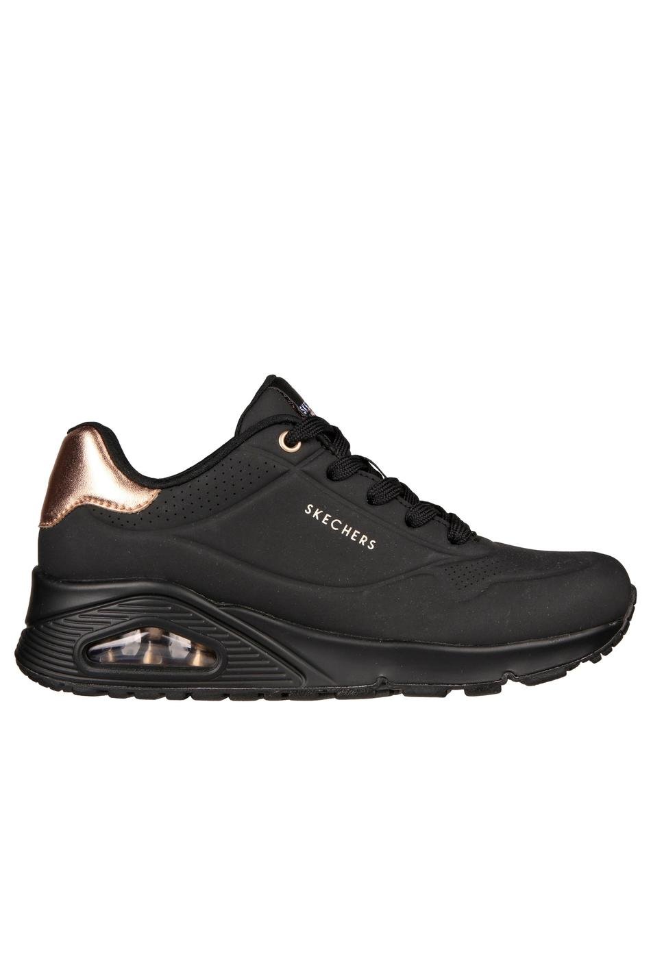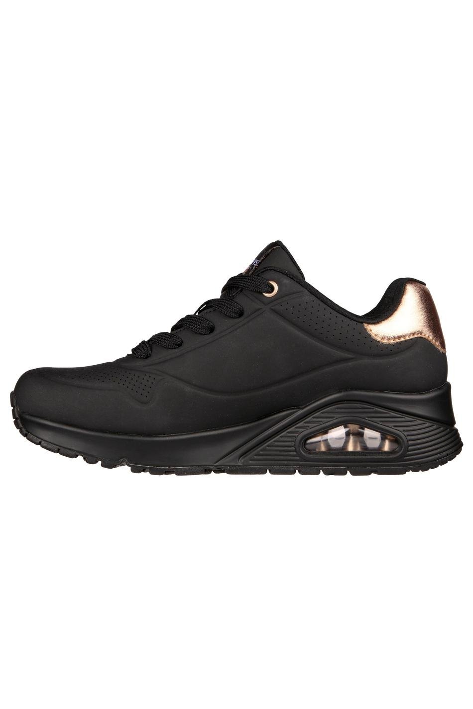 Skechers Street UNO Golden Air in white trainers with metallic gold accents. Features cushioned Air Cooled Memory Foam insole, visible Skech Air midsole and durable lace up design. These runners are designed for comfort.