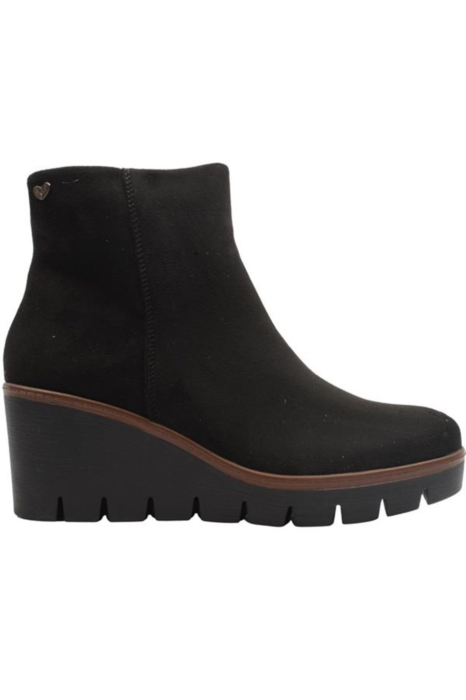 A sleek black ankle boot with a soft upper and chunky wedge sole. Perfect balance of style and comfort for effortless everyday wear.
