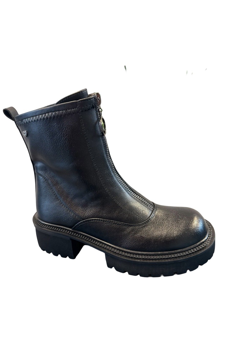 Tough yet refined, this black ankle boot features a front zip and chunky sole for an edgy urban look.