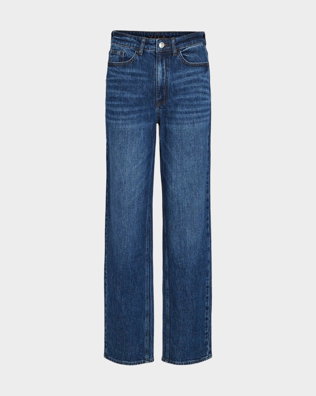 Blue straight fit jeans with a high waist and traditional five pocket design. A wardrobe staple made for everyday wear and easy pairing.