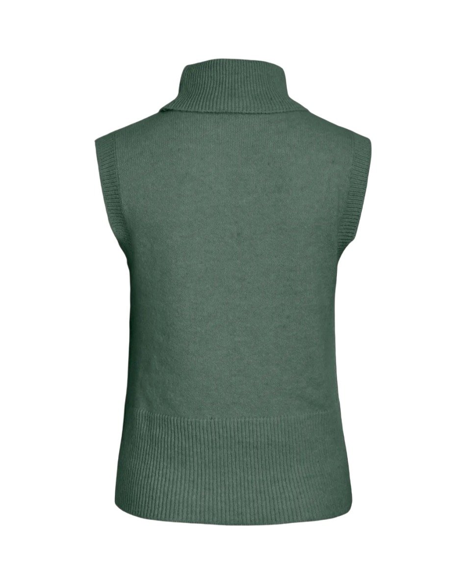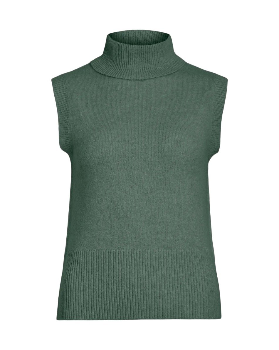 Sleeveless knit with high neck and ribbed hem, perfect for layering or wearing alone to create a sleek, minimal look.