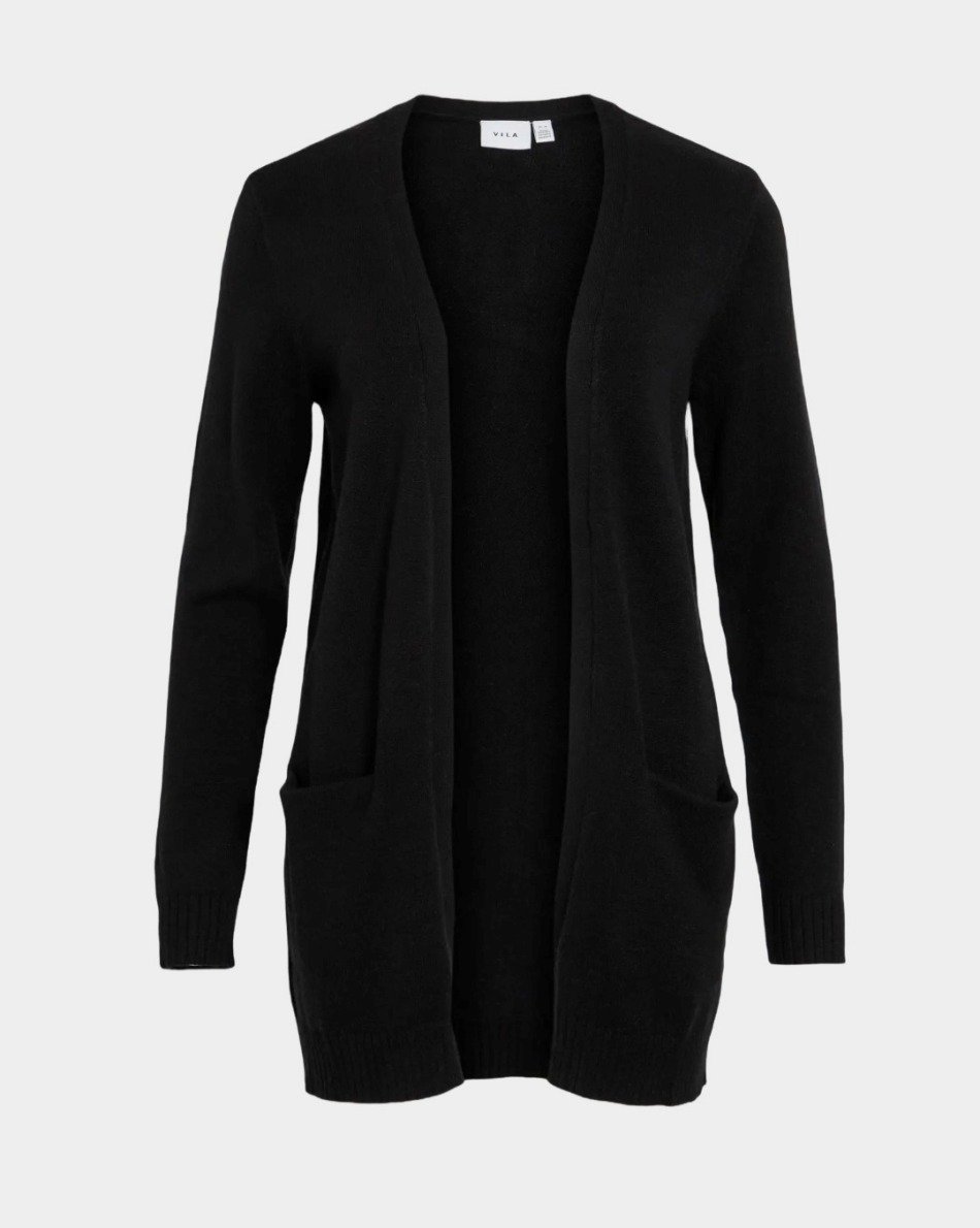 Cosy up in this black knit cardigan with open front and patch pockets, where comfort meets cool.