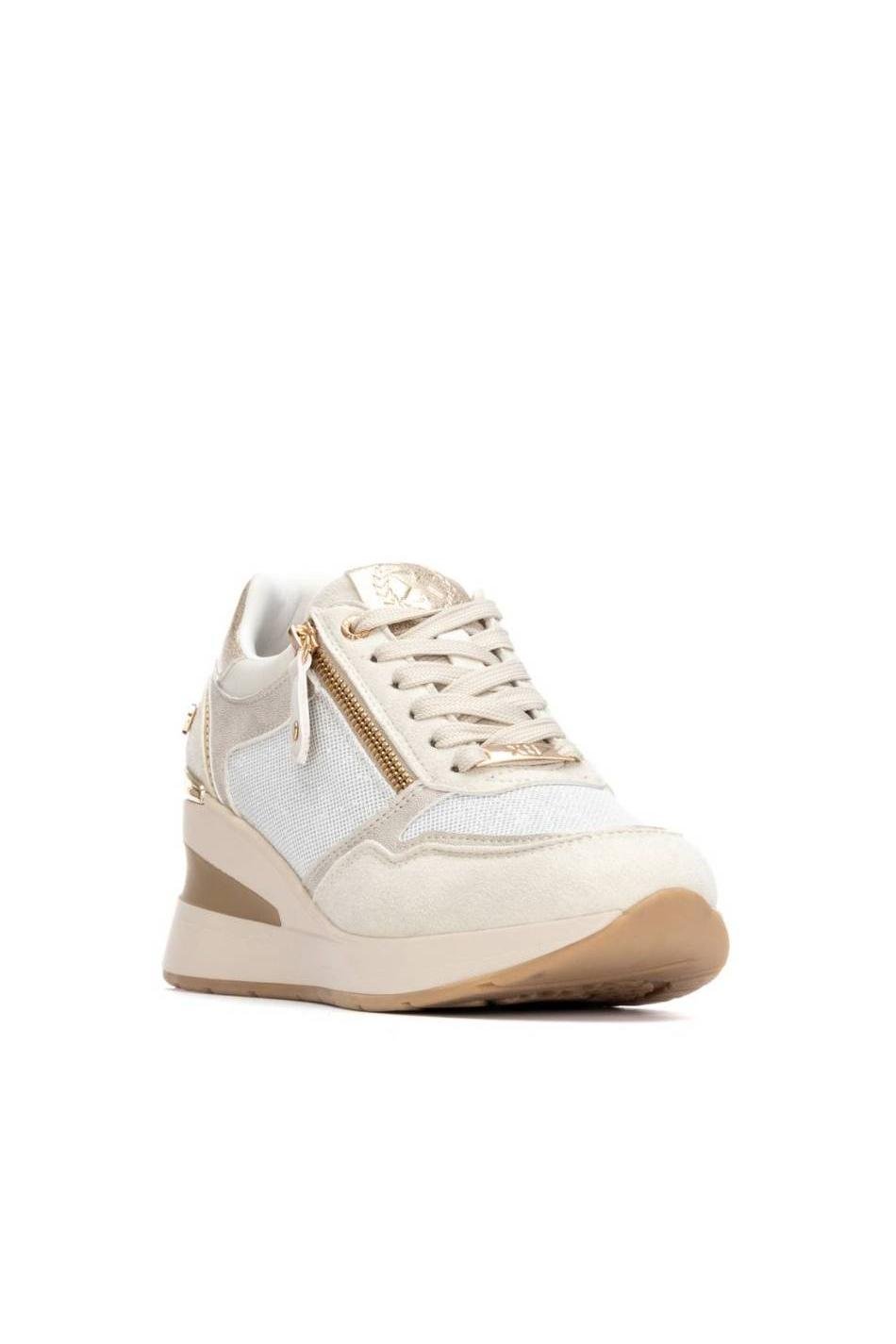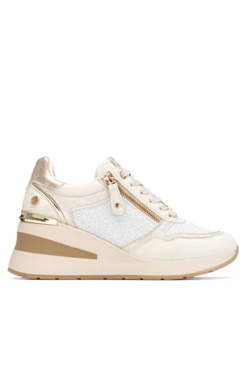 A blend of sport and sparkle, this creamy wedge sneaker glows with gold-tone accents and soft textures. Luxe comfort made to elevate everyday looks.