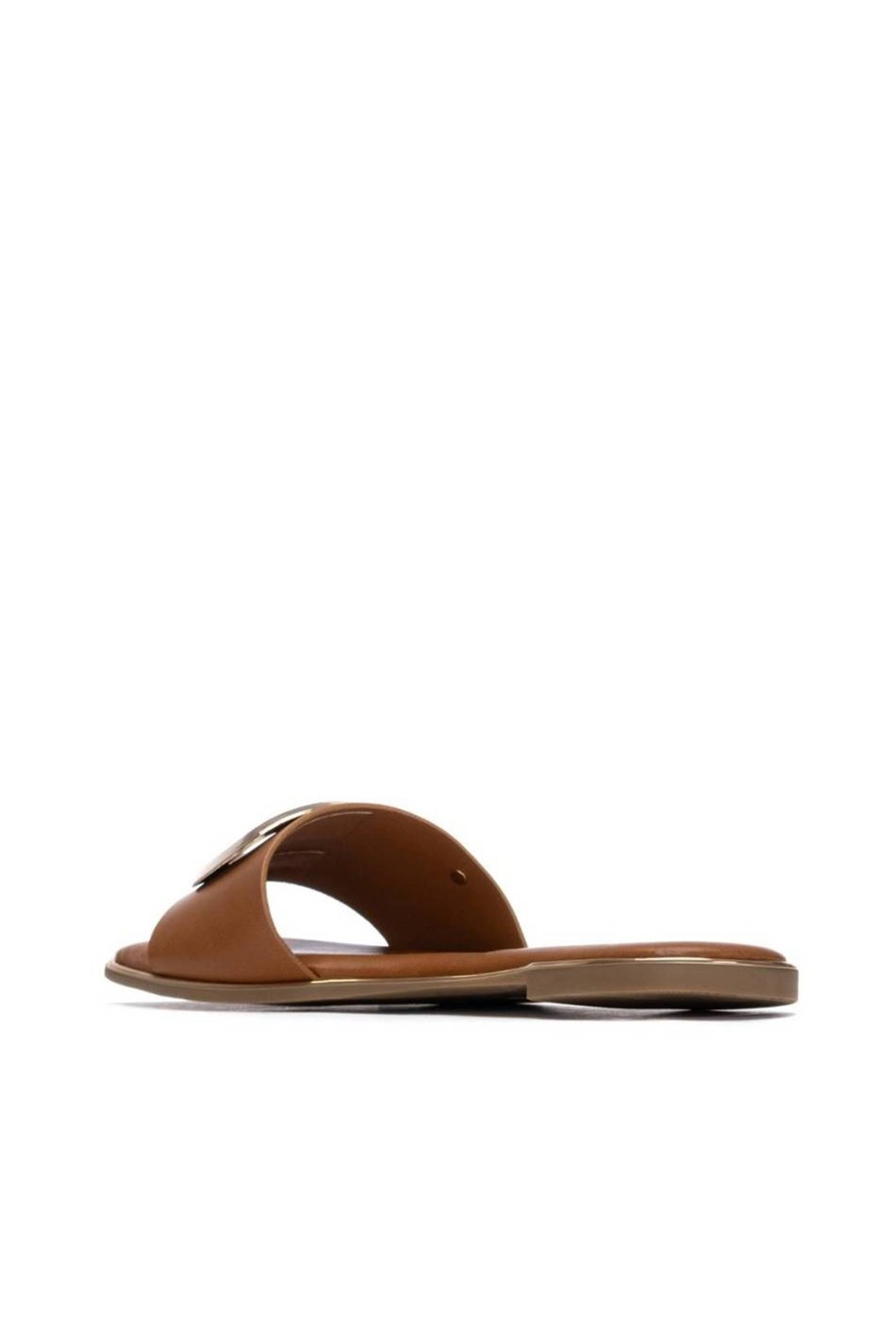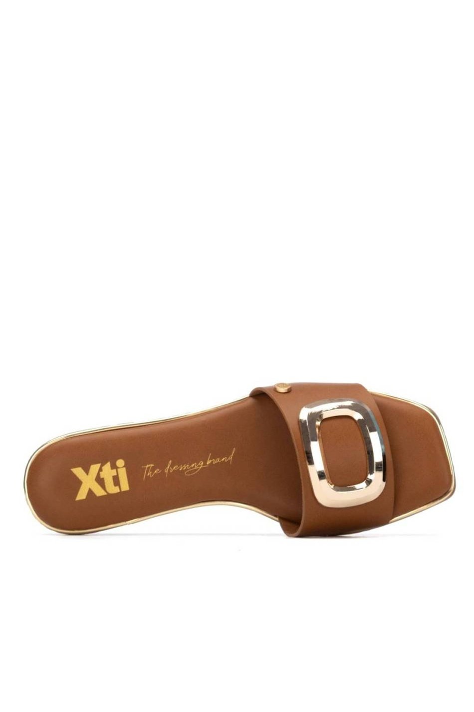 XTI camel brown flat sandals with buckles and cushioned soles. These flats are great slip on comfort sandals.