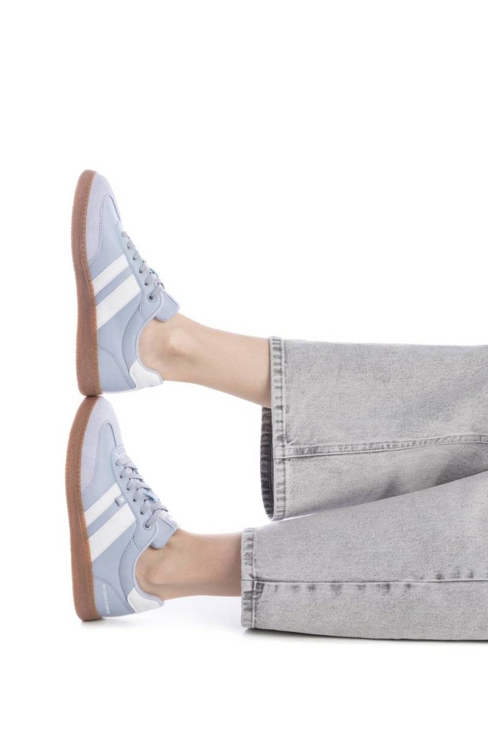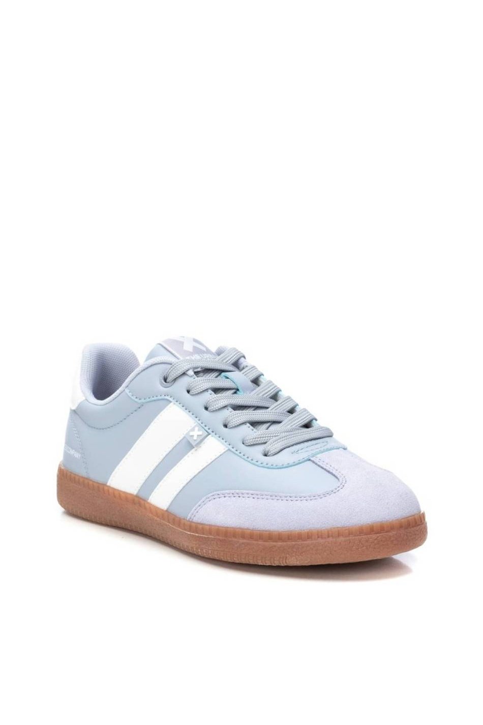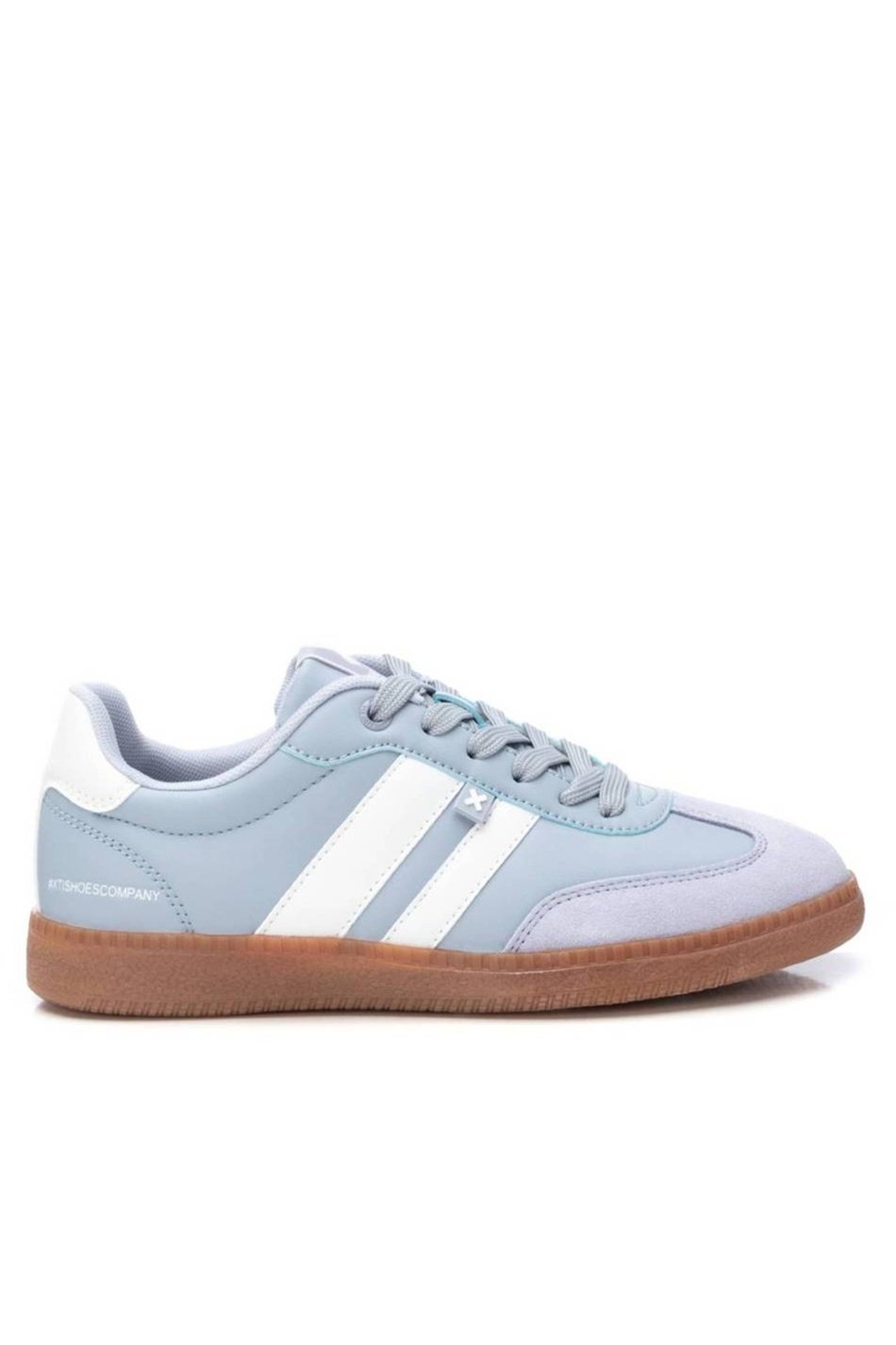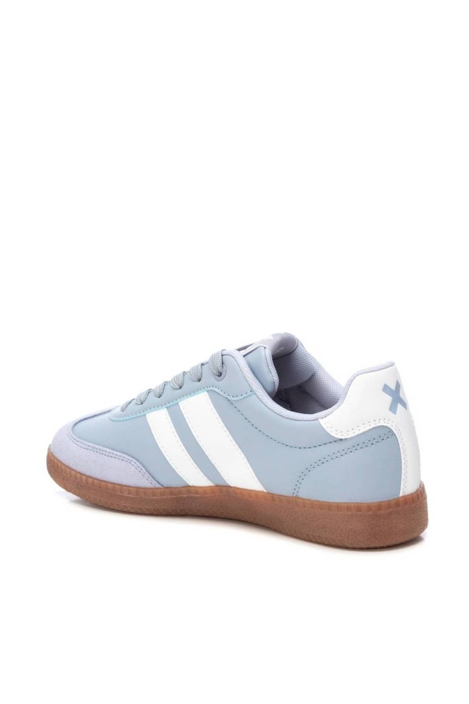 Samba style baby blue XTI trainers with white stripes and gum sole. These adidas style runners are designed for steady movement.