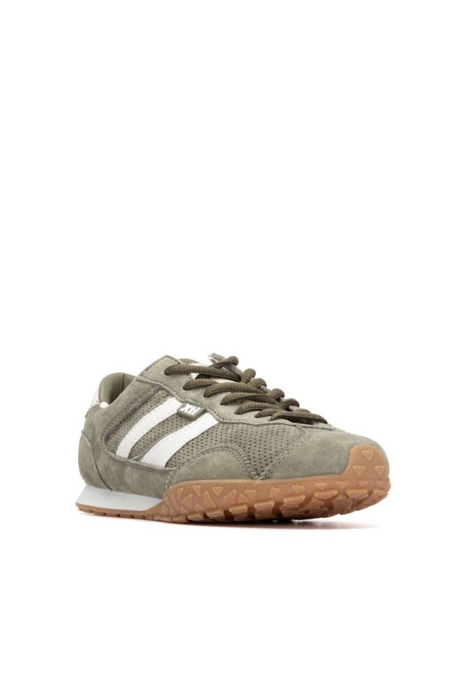 Sport inspired khaki adidas style XTI trainers with white stripes and octopus soles.