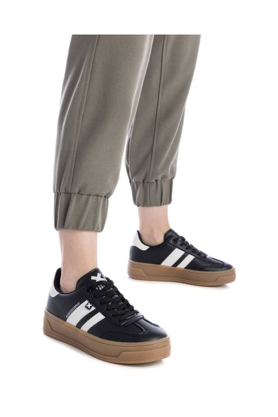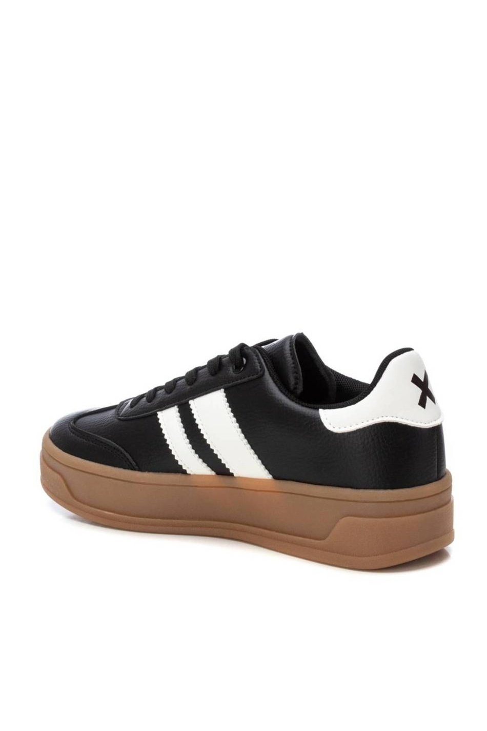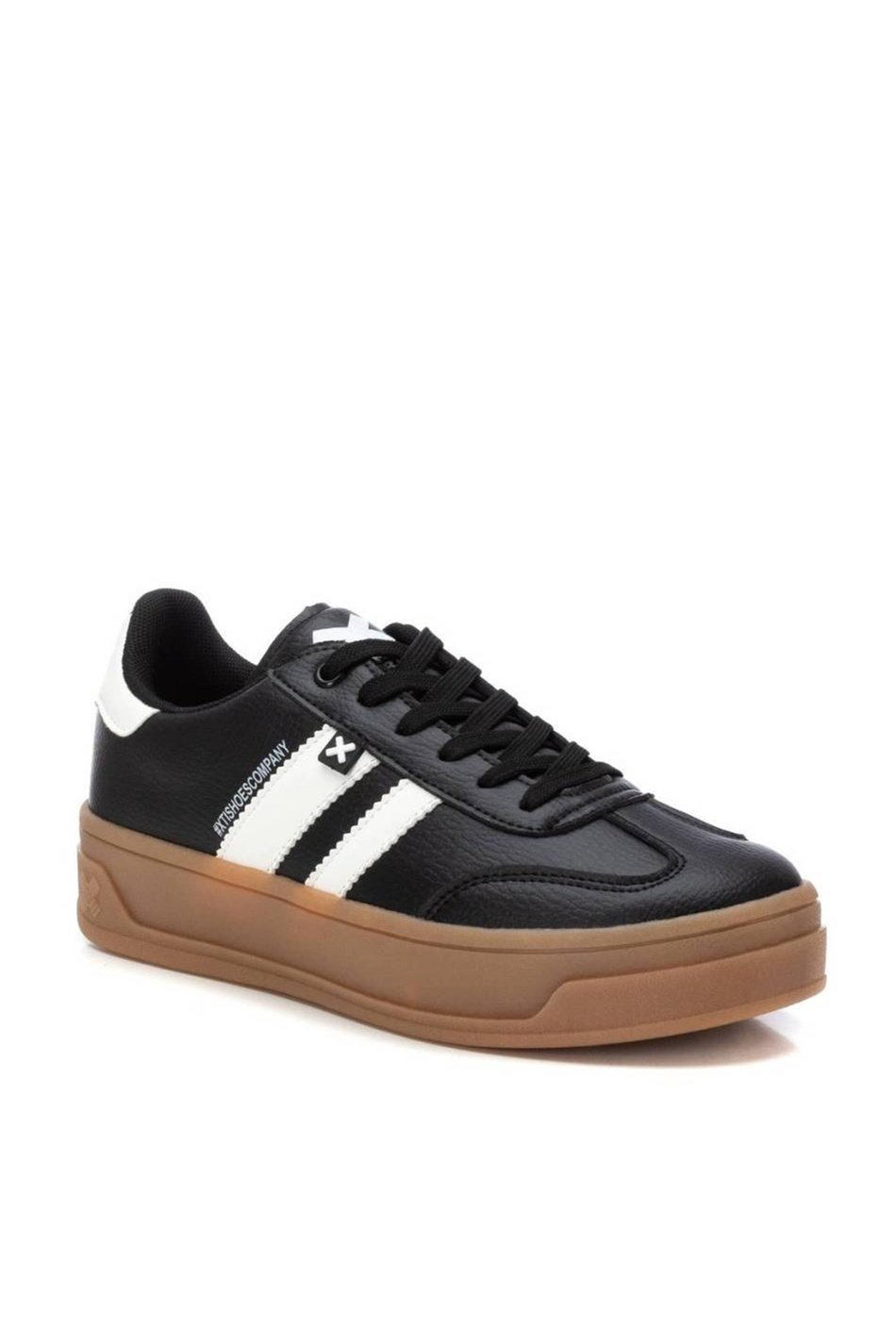 Adidas style black XTI platform trainers with white stripes and chunky sole. Double sole provides lifted style. Gum sole ensures steady footing.